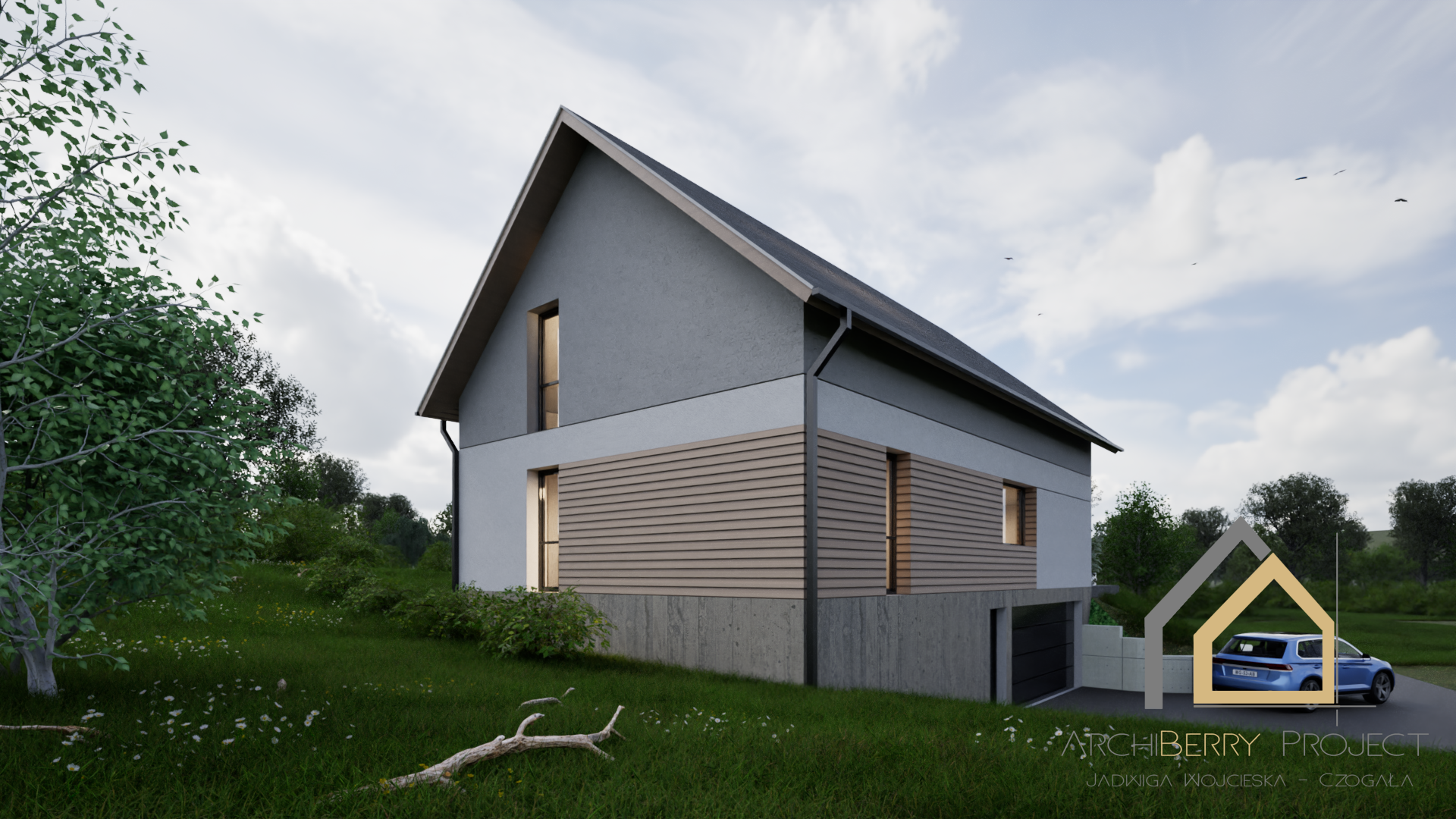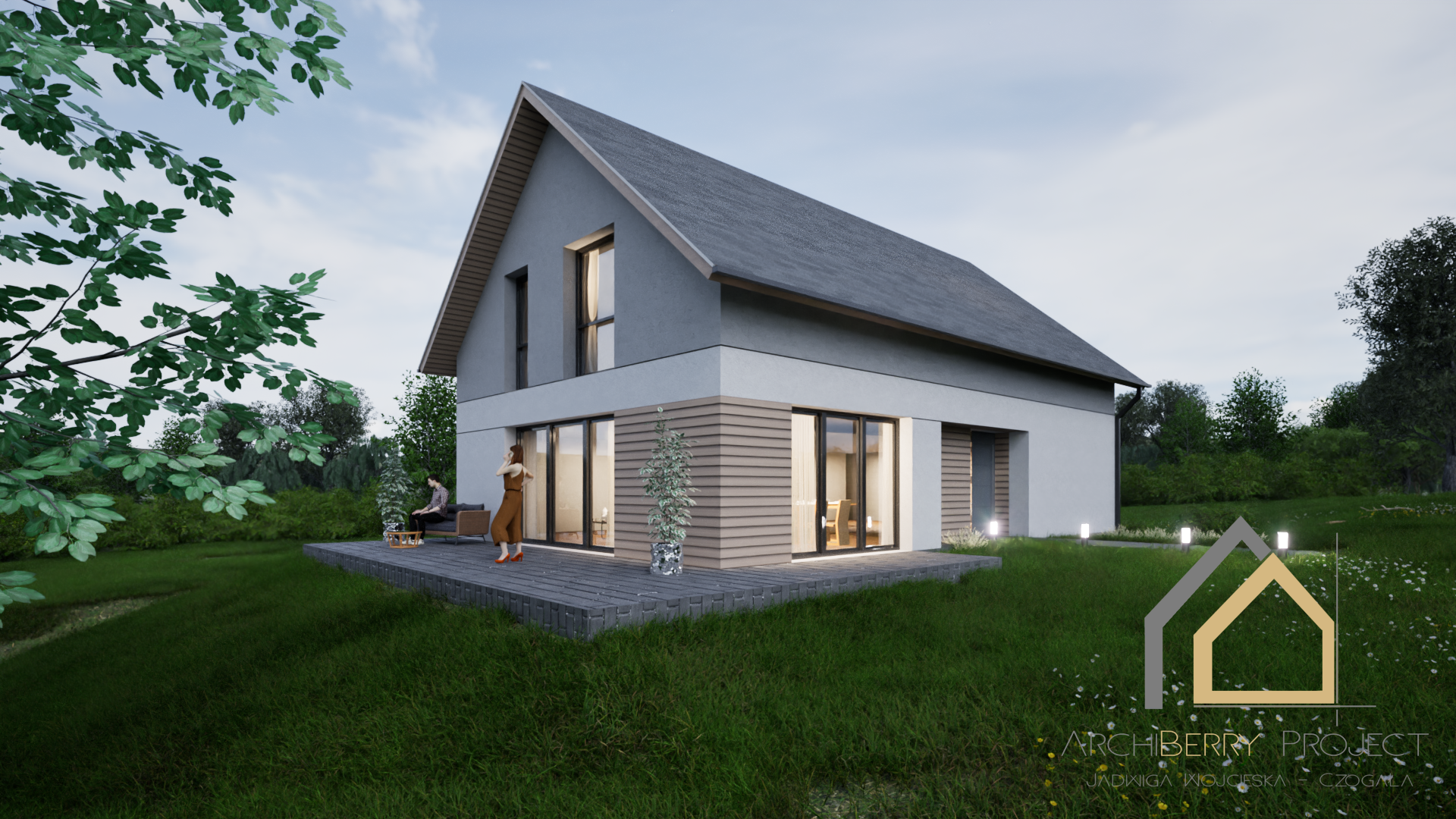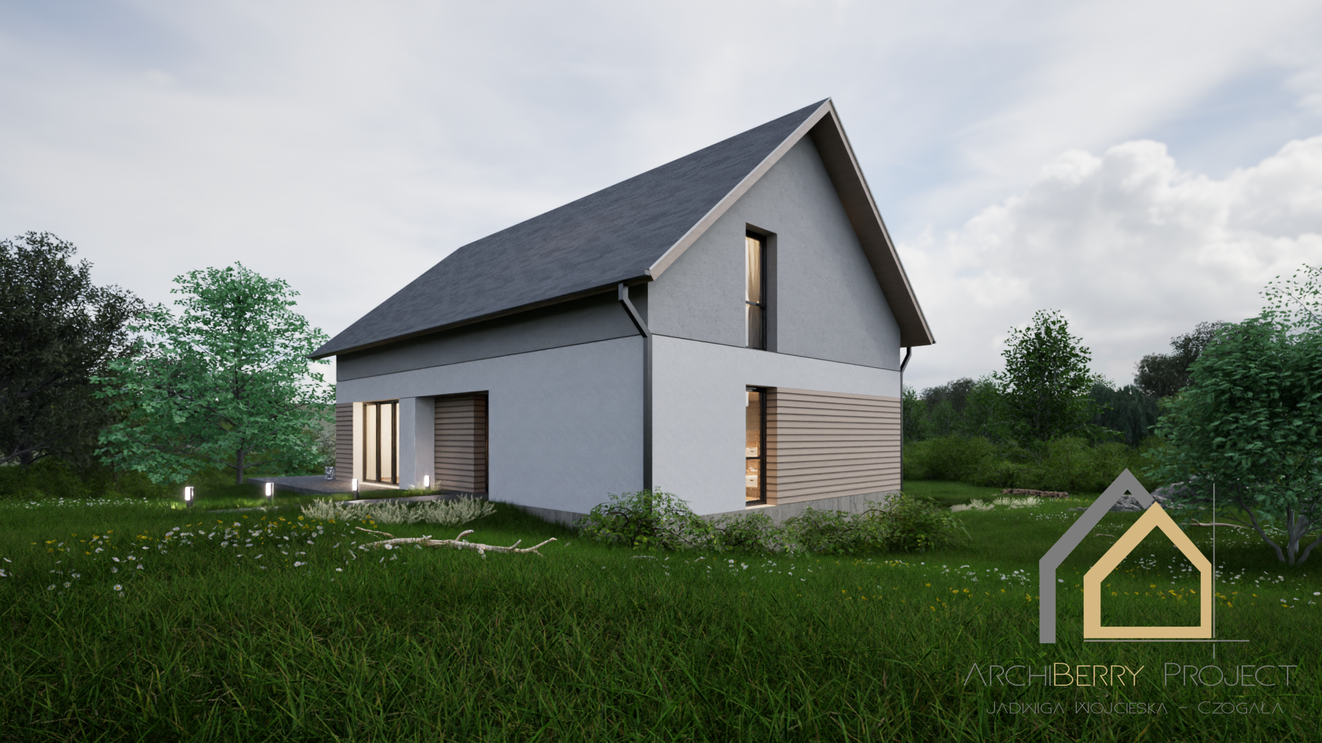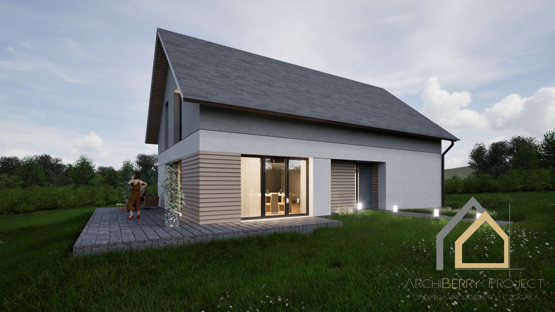 Projekt zapewnia wyraźny podział stref: dzienną, nocną i gospodarczą, co podnosi wygodę użytkowania. Dom jest idealny dla rodziny 2+3 lub 2+4, która ceni przestrzeń, funkcjonalność i ponadczasową estetykę.