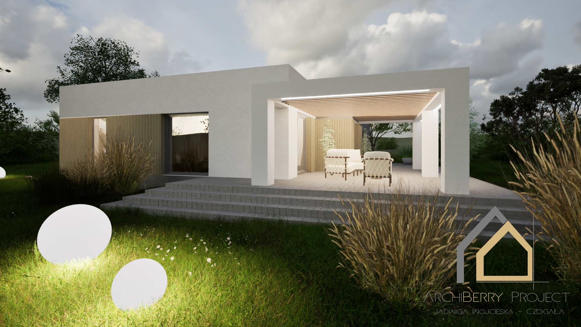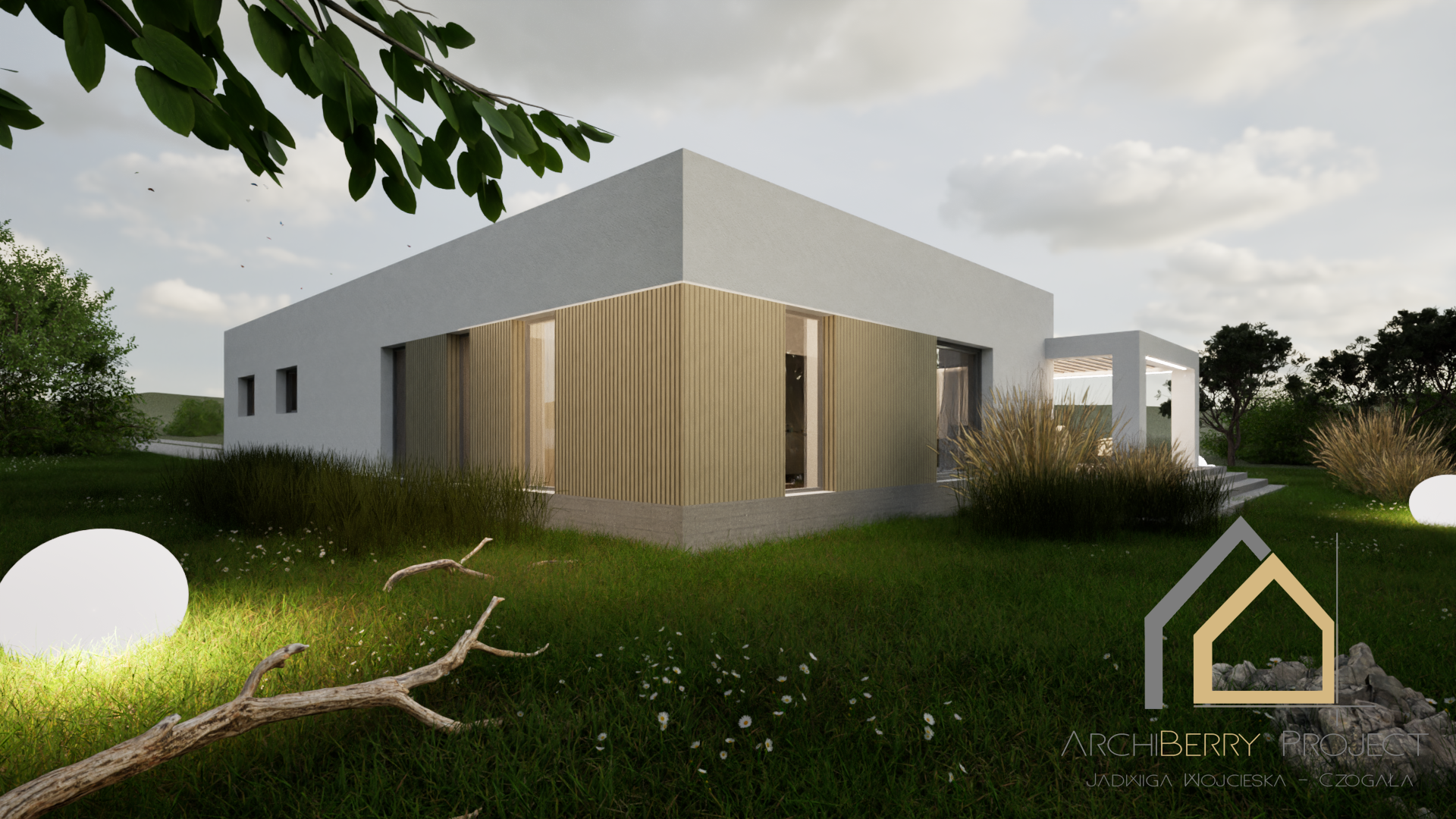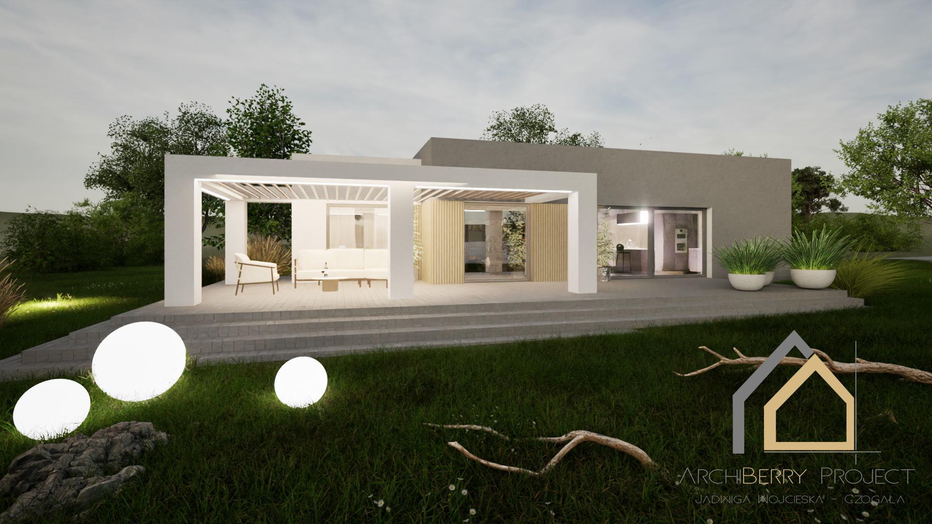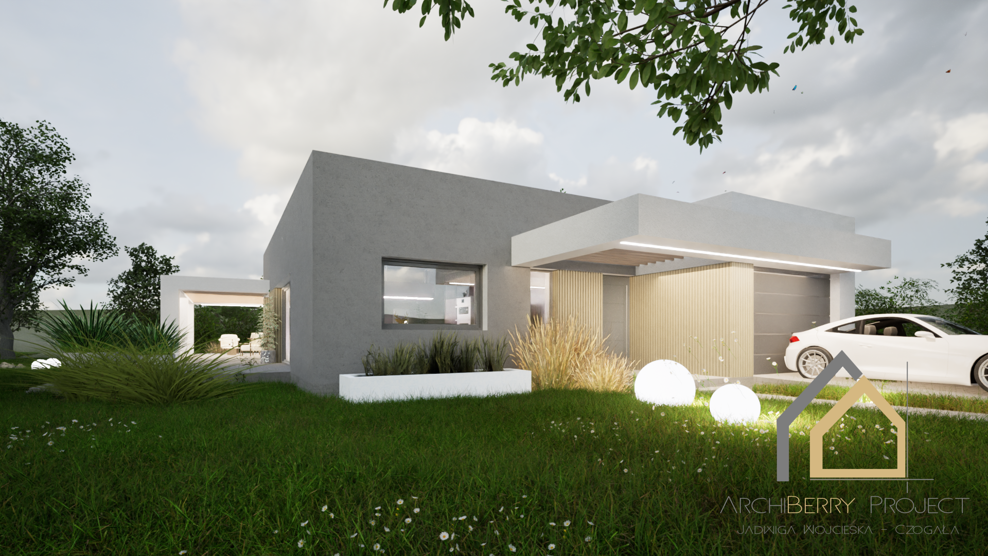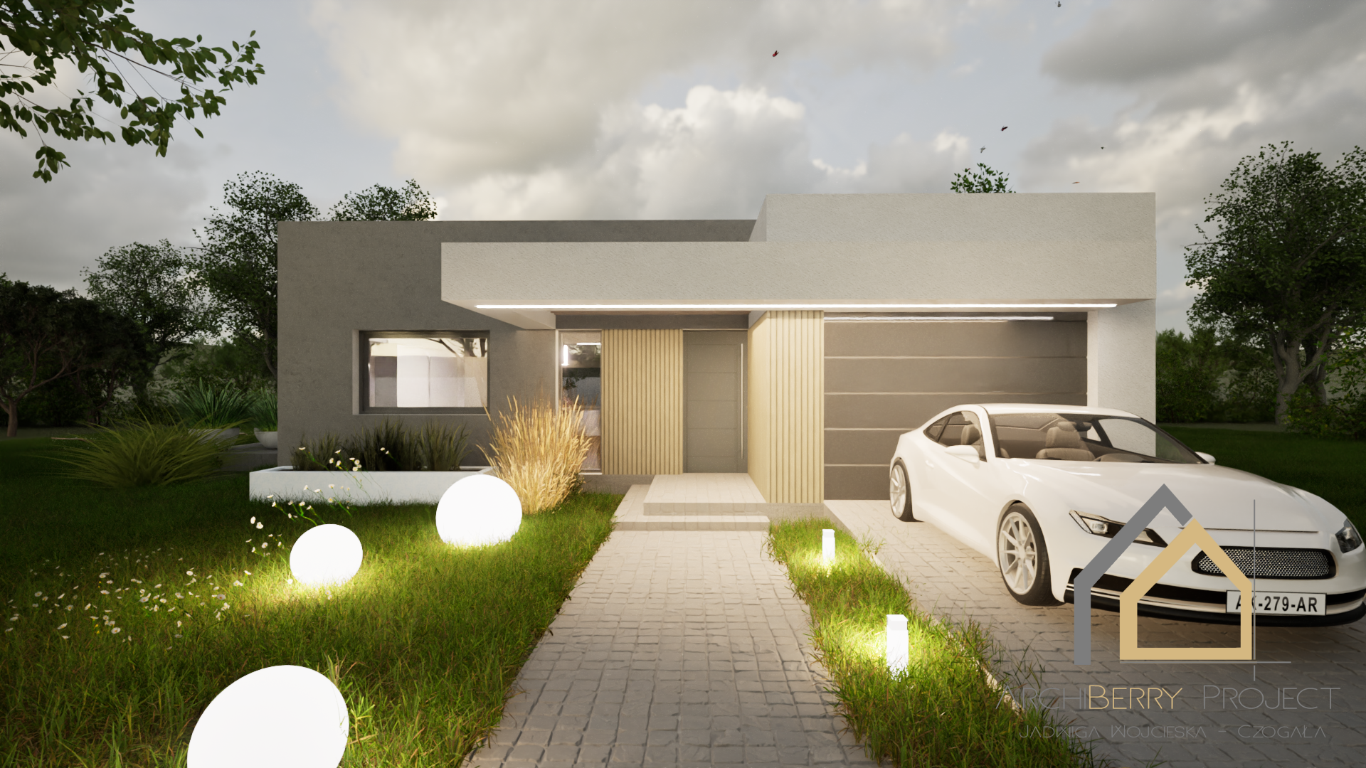 Projekt parterowego domu, wyróżniającego się prostą i nowoczesną bryłą oraz przemyślanym podziałem na strefę dzienną i nocną. Dom został zaprojektowany z myślą o funkcjonalności i komforcie mieszkańców.